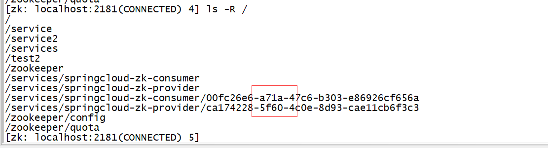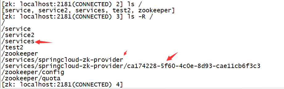 可以发现,服务已经注册到zookeeper了,其中/services ,/services/springcloud-zk-provider 是持久节点/services/springcloud-zk-provider/ca174228-5f60-4c0e-8d93-cae11cb6f3c3 是临时节点。